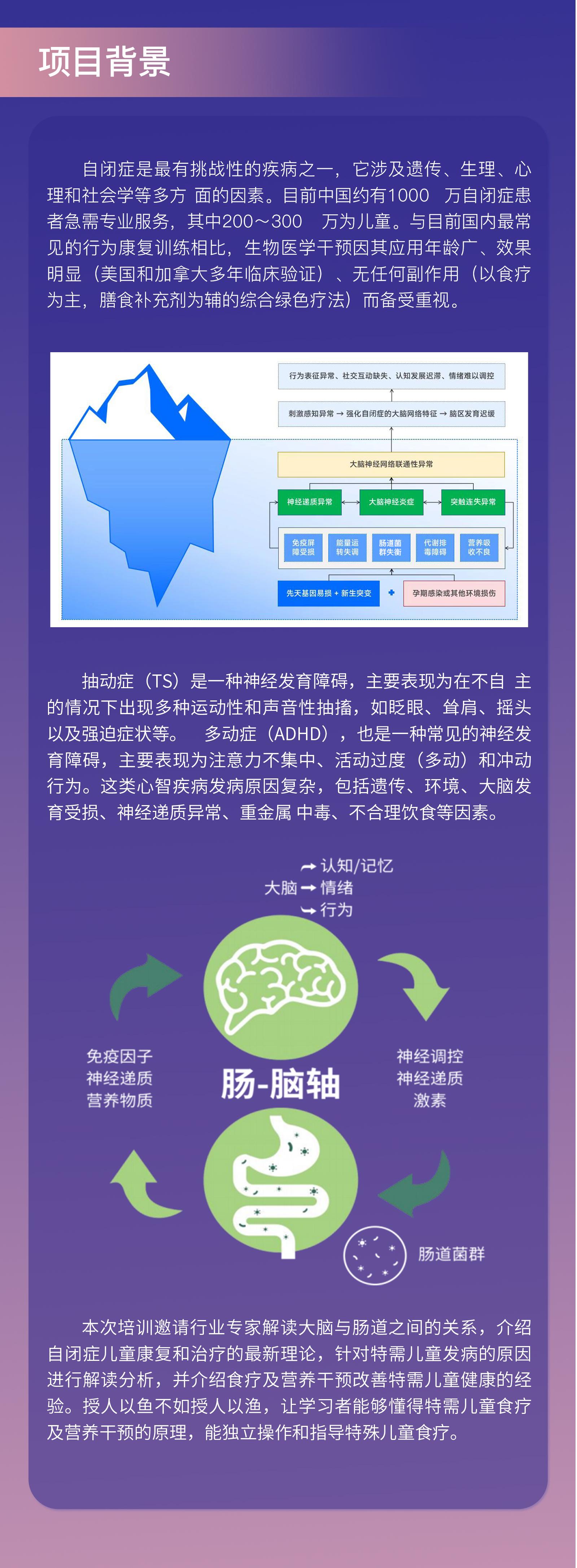 本次培训邀请行业专家解读大脑与肠道之间的关系,介绍自闭症儿童康复和治疗的最新理论,针对特需儿童发病的原因进行解读分析,并介绍食疗及营养干预改善特需儿童健康的经验。授人以鱼不如授人以渔,让学习者能够懂得特需儿童食疗及营养干预的原理,能独立操作和指导特殊儿童食疗。