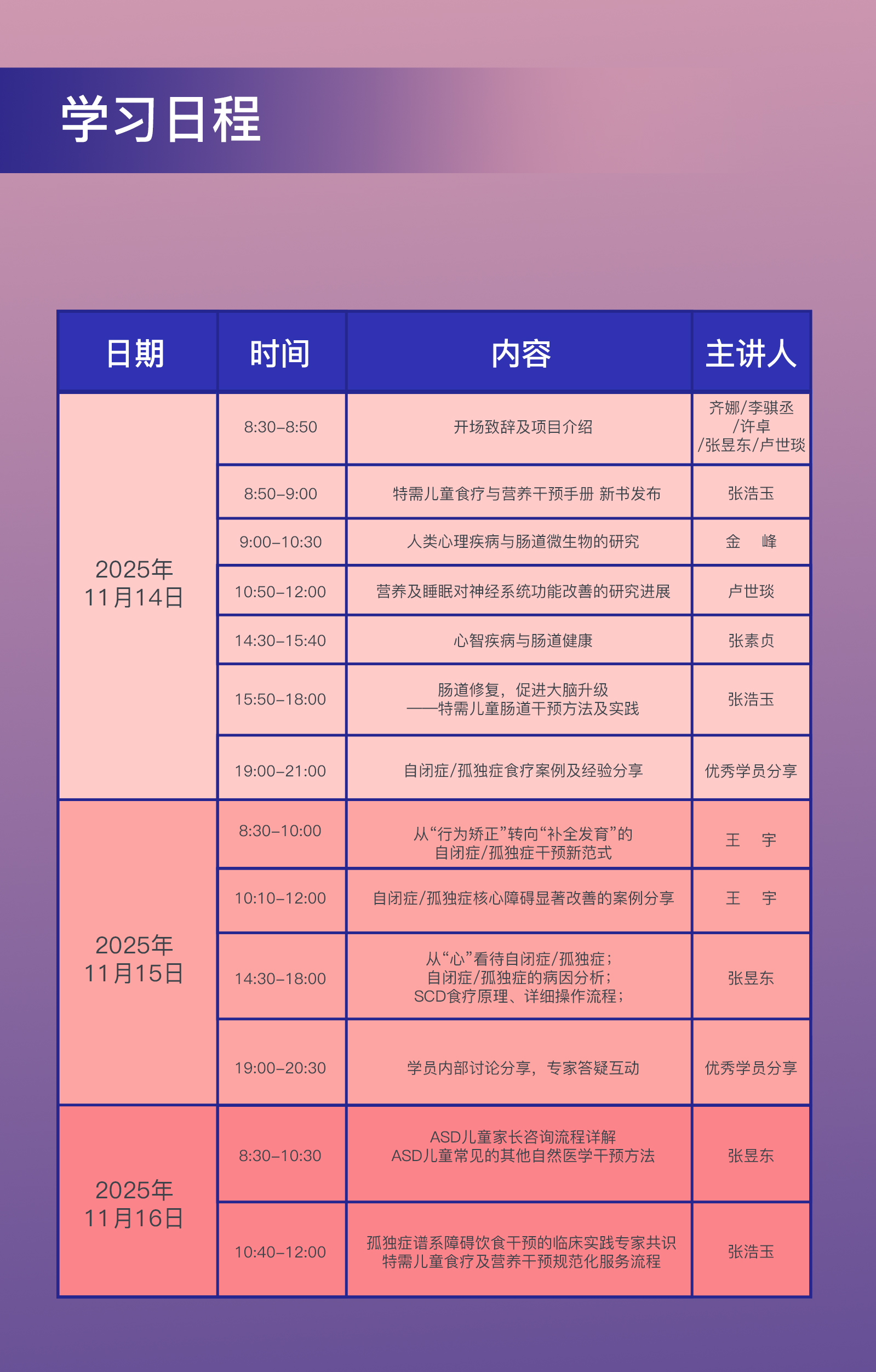 营养师/健康管理师/医生/护士/心理咨询师/家长;从事自闭症、抽动症治疗干预的医疗、健康机构的从业人员;有食物烹饪、食疗操作基础;擅长与人沟通,有医疗、健康个案咨询干预经验;希望掌握自闭症、抽动症的营养医学相关专业技能;有自闭症、抽动症孩子的家长,愿意执行特殊儿童营养医学;干预,并有意帮助更多特殊儿童家庭的推广者。